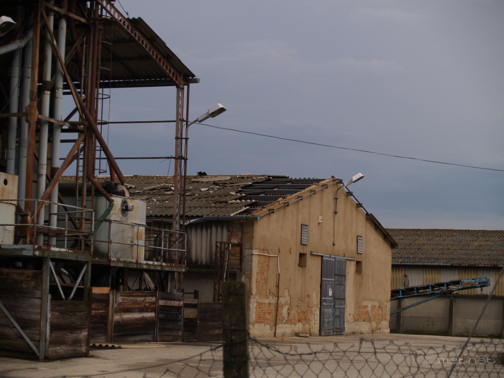 | Leírás: A temetõ szomszédságában lévõ terményszárító oldalát és a mellette álló magtár tetejét is megkezdte a szél! | |