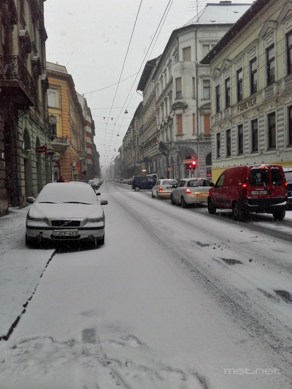 | Leírás: Hazánktól délre örvénylõ mediterrán ciklon egyik csapadékmezeje, -7-8 °C, 3 cm porhó | |