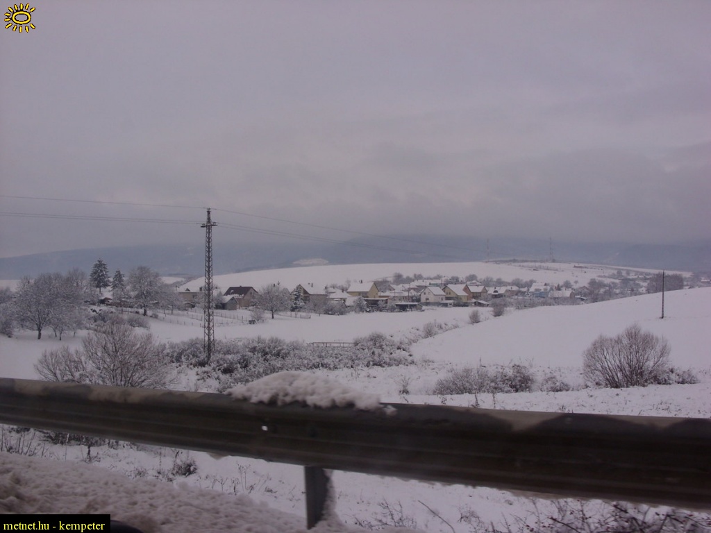 | Leírás: 15-20 hó hullott a térségben 2008.november 24-25 -én. Budapest felé,a 21-es számû fõúton ,autóból fényképezve. A képen Mátraszõlõs település látható,"mögötte" a Cserhát hegyvonulat felhõben. | |