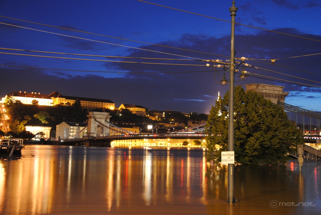 Leírás: Az áradó Duna és a díszkivilágítás nélküli Lánchíd.