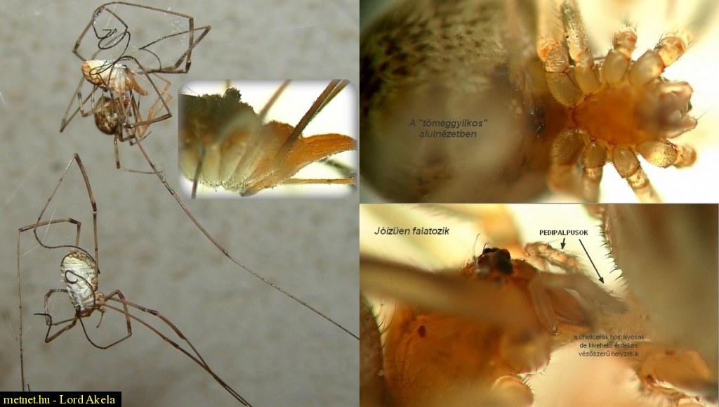 Leírás: Két párzás közben megölt kaszáspók "gyilkosa" alulnézetben ill. "falatozás" közben