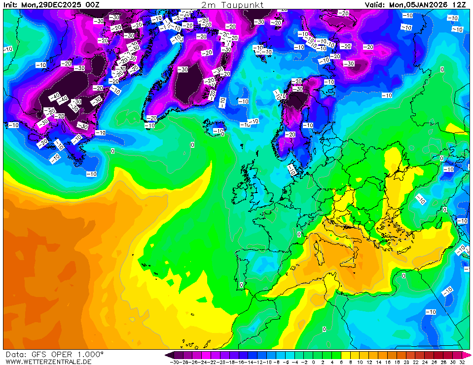 Különösen feltűnő a harmatpontok zuhanása az éjféli futáshoz képest, néhol 8-10 fokkal alacsonyabb a várt harmatpont: