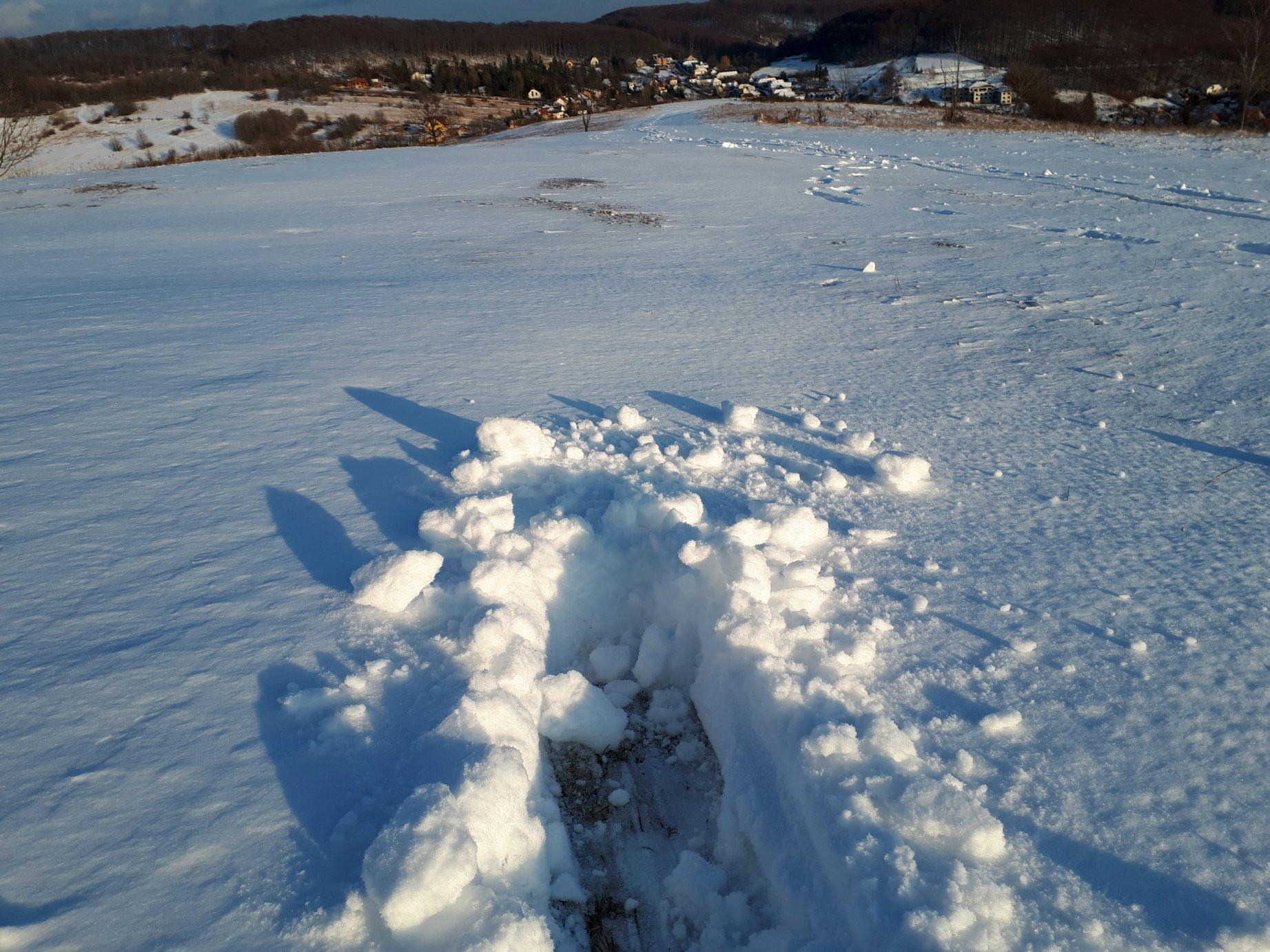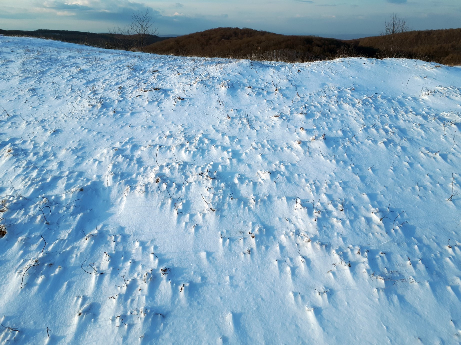 Kb. 3-5 cm, már éppen nem olvadó hó, amit a dombtetőn hordott az erős szél: Link