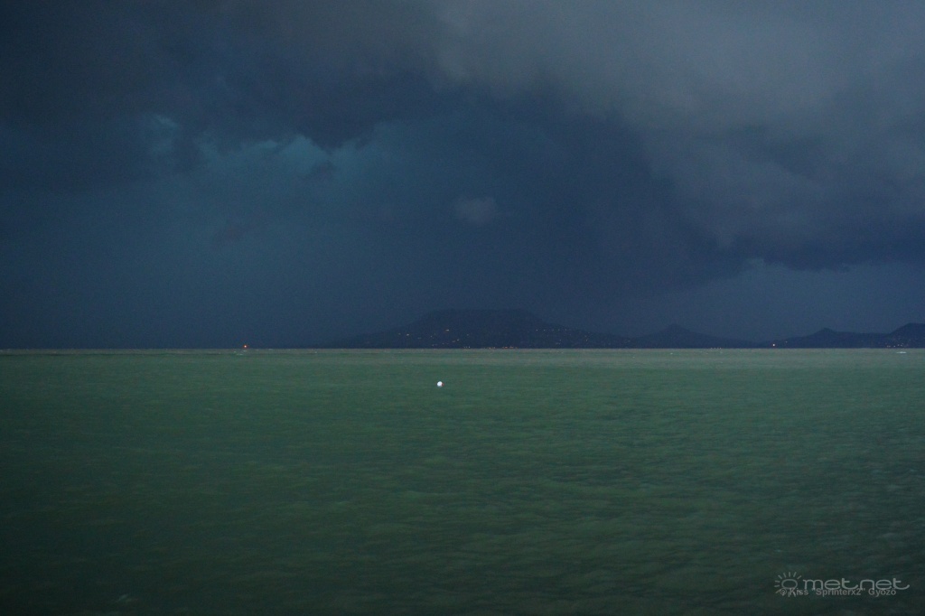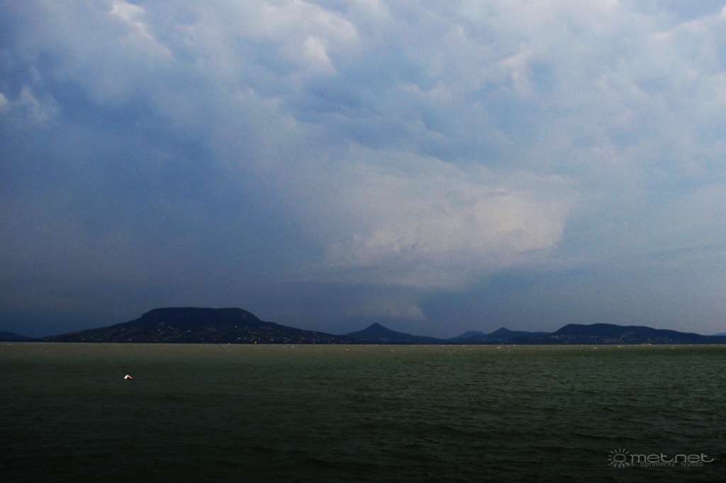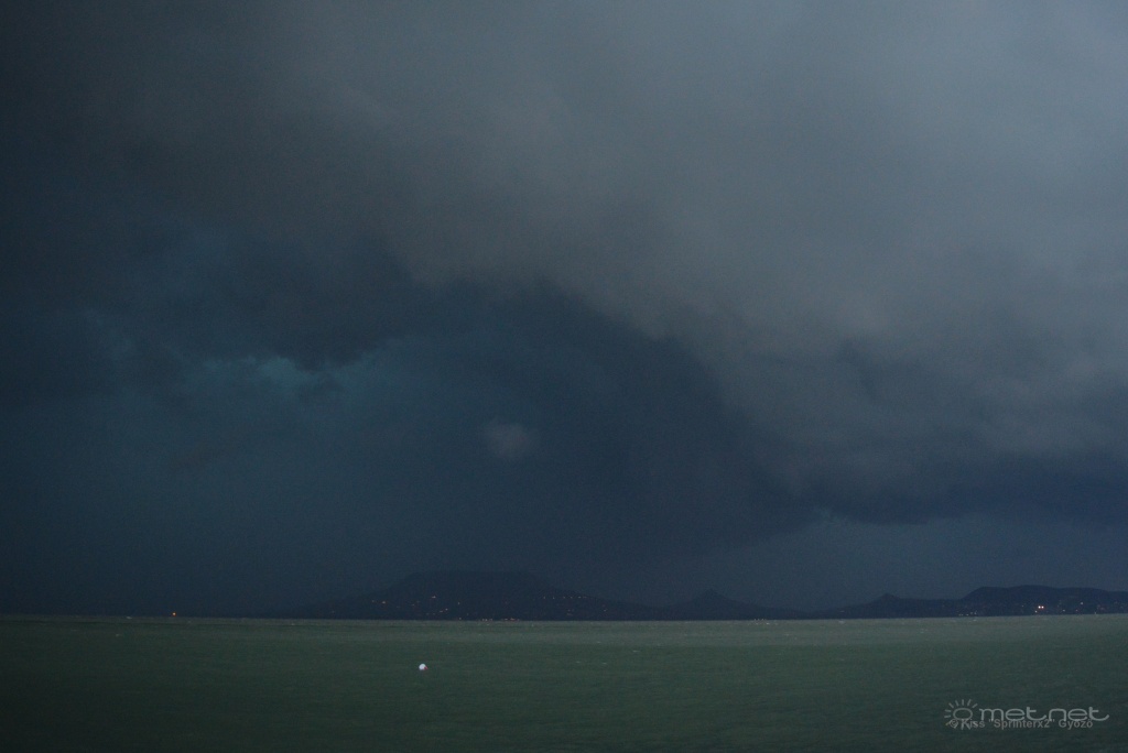 Tegnap délután a kapolcsi Művészetek Völgyét kerestük volna fel. Mivel nagyon sütött a nap és elég meleg is volt, előtte lementünk az Akali melletti Fövenyes strandjára. Már akkor feltűnt az élénk, gyakran erős k-i szél, mely fél méternél magasabb hullámokat hajtott a kövezésnek. A Balatonon ez kissé szokatlan, ti. ilyen hullámzás az északi parton rendszerint délnyugatról, délről jön a nyári félévben. 5 óra után igen gyors ütemben távoli zivatarok magas szintű "atomfelhője" emelkedett a parti dombok fölé, a nap elbújt. Cb-k nem látszottak, ezért nem tartottam aggasztónak a helyzetet. Az Akali-Dörgicse-Mencshely-Nagyvázsony-Vigántpetend útvonalon elindultunk a Völgybe. A Nagyvázsony mellett fekvő Nemesleányfaluig jutottunk. Onnan már látszott, hogy erősen feketedik az ég alja, pontosan abban az irányban, amerre menni kellett volna. A radar is erős zivatartömböket mutatott a Balaton nyugati része felett. A biztonság kedvéért visszafordultunk Nagyvázsonyba, ahol a főutcán működő pub-pizzériába tértünk be azzal, hogy ott kivárjuk, hogy alakul a helyzet. Elég sokáig az volt a helyzet, hogy nyugaton, délnyugaton volt a sötétség, fölöttünk mammák lógtak, ill. elszigetelt gomolyok emelkedtek itt-ott. Aztán hirtelen éjsötét, bazi peremfelhős struktúra jelent meg nyugat felé. Ez gyorsan közeledett, késő esti sötétséget, totál kaotikus égképet hozva. Hamarosan viharos kifutószél támadt, és elkezdett esni, majd szakadni az eső. Rendkívül heves zivatar alakult ki. Északnyugatra stroboszkóp-szerű villogás volt jó ideig, a dörgések folytonos zúgásba olvadtak össze. Ázott ürgeként érkeztek a vendéglőbe menekült bringások, meg jónéhány autós is (vélhetőleg a Völgyből jöttek fel)