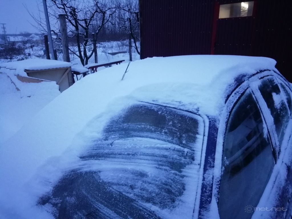 Hajnal óta újra havazik, az utóbbi órában közepes intenzitással. Éjjel már csak lepelnyi esett, de a reggeli havazással együtt ujabb egy centivel gyarapodott a hótakaró, 7 cm friss, 9 cm a hótakaró.