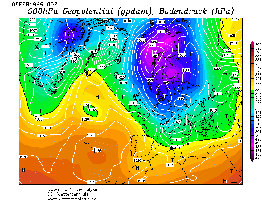 Konkrét ennek az a lényege, hogy az észak-atlanti ciklonok teknőjének déli felén aktivizálódik a mediterrán ciklontevékenység, majd ennek hátoldalán betör hozzánk az északkelet-európát kitöltő sarki levegő. Fontos tudni, hogy itt nem a teknő hátoldala kapja a főszerepet, hanem a kelet-európai fagyos légtömegek a teknőről lefűződő ciklon közvetett hatása miatt utóbbi lesz ránk hatással. Természetesen itt egy szépen blokkoló AC-vel közös áramlási mezőben az AC peremén utat törhet magának a sarkvidéki léghullám. Az Észak-Atlanti teknőbe nem ritka mikor behatol a sarki légtömeg a téli szezonban majd a teknő déli felén megerősödik a ciklontevékenység, ami nálunk mediterrán ciklont jelenthet. A régi GFS-en ez látható, csúszópályás medi.