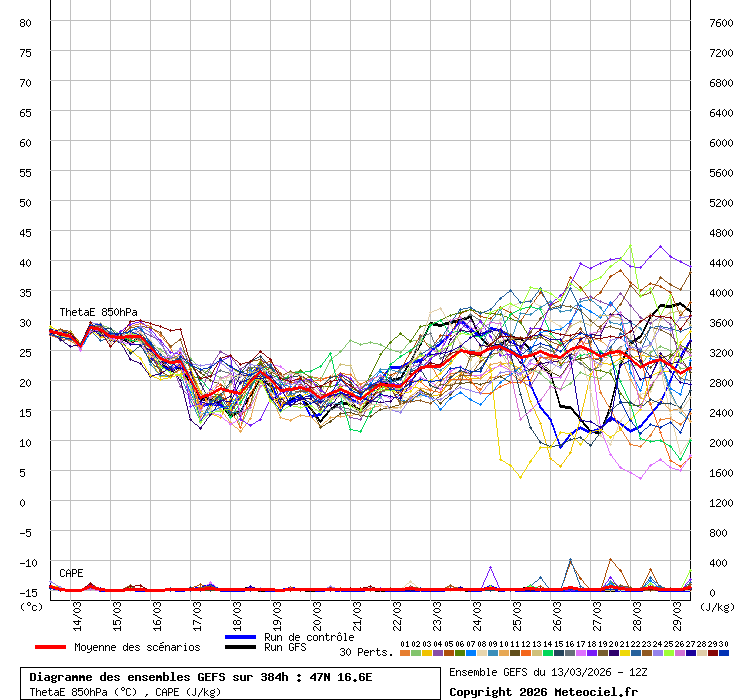 És megint (vagy inkább még mindig), GFS operatív 150-200 J/kg-os CAPE, ENS tagok 700-900 J/kg-os CAPE. Link