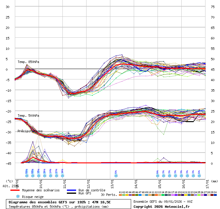 Ahhoz képest, hogy közeledünk az idõponthoz, inkább nõtt, mint csökkent a bizonytalanság ide. Az UM és az osztrák ALARO gyakorlatilag kivette a csapadékot, 1-2 cm hó lehetne maximum azok szerint. Az ECMWF tartja a tegnapi 6 mm-t, ami 6-8 cm havat jelenthetne. A GFS jelentõsen növelt a mennyiségen, fáklyaszinten is, tegnap még csak az 5 mm-t karcolta az átlag: Link A GEM pedig hóba fulladást vár továbbra is.