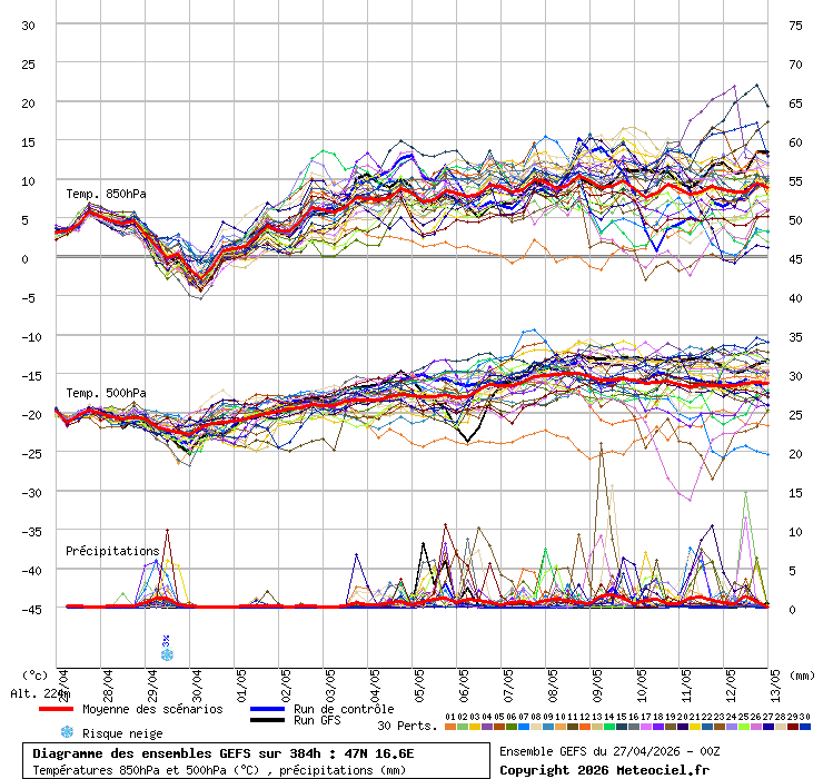 A száraz levegõ mindenképp kell majd, ha az nem ér ide, akkor valóban megállhatunk 12-13 fok környékén. Nagy szél viszont nem szükséges, a fõnök nagy részében itt csak gyenge szél szokott fújni (kivéve a hidegfrontos fõnt, amikor esetenként itt is mérsékelt-élénk északnyugati szél fúj). Persze a szélcsend megint nem jó, mert egy minimális átkeverés azért kell. Az egyetlen modell, ami vár 15 fokot is, az továbbra is a meteocenter-es WRF: Link