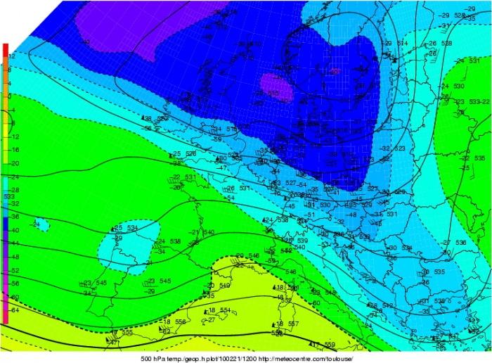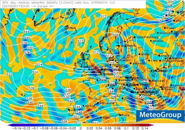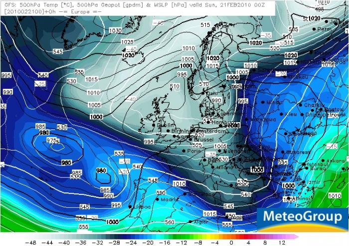 2010. február 21-e környékén Közép-Európa idõjárását egy alacsonynyomású teknõ határozta meg, mely folyamatosan haladt nyugatról keleti irányba. A GFS elõrejelzési térképén a 2010.02.21-i 00 UTC-s helyzet látható.