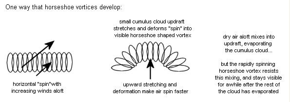 A besugárzás hatására kialakuló feláramlások a magasban a komoly vertikális szélnyírású mezõbe ütköznek, mely mezõ a feláramlást horizontális örvénylésre kényszeríti. Az emelkedõ levegõ viszont tovább emelkedik, meghajlítva ezzel a horizontális örvényt, így kialakul a lópatkó forma. Ha elegendõ nedvesség található a levegõben, akkor a kondenzáció révén láthatóvá válik az örvény. A gyors forgás hatására nehezebben keveredik hozzá száraz levegõ, így tovább marad életben általában, mint a körülötte lévõ gomolyfelhõk. A nem mezociklonális örvények közé sorolandóak, azon belül pedig a szép-idõ örvényekhez. Talajt csak a legritkább esetekben érnek, így az eddigi megfigyelésekbõl károkozásról sincs tudomásunk.