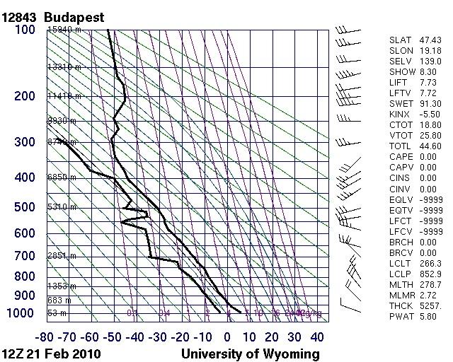 A Budapest-Lõrincen 12 UTC-kor indított rádiószonda az alábbi képet vázolta fel a légkör aktuális vertikális szerkezetérõl. Alapvetõen nem látható rajta, hogy komolyabb szélnyírás lett volna, talán a középszinten megfigyelhetõ kisebb irányváltás és kismértékû szélerõsség növekedés elegendõ lehetett a képzõdmény kialakulásához.