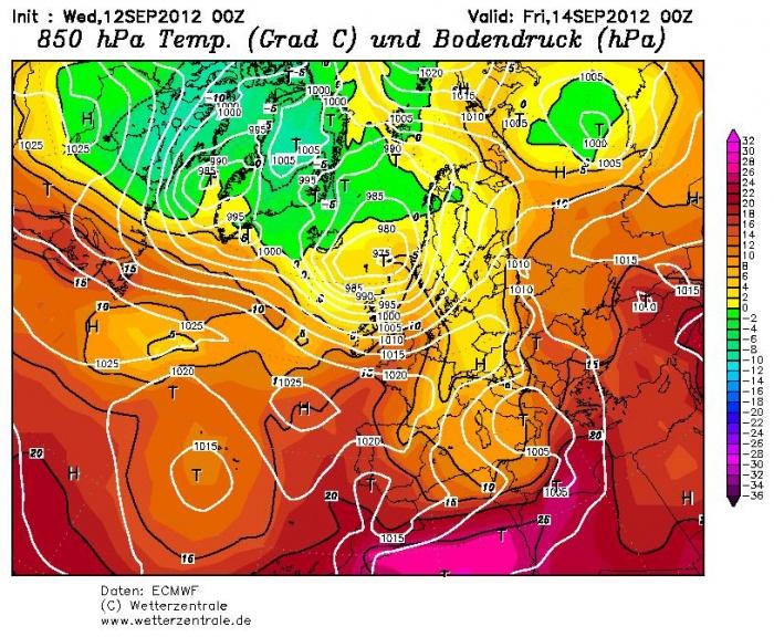 Az ECMWF nyomás- és 850 hPa-n elhelyezkedõ hõmérséklet-térképe péntekre virradóra (hidegfront az ország felett)