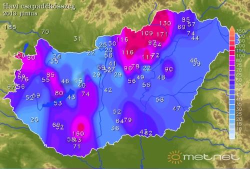 A legtöbb csapadékot bécsi észlelõnk, Nyuli mérte, nála 184,8 mm lett a hónap csapadékösszege. Belföldön Miskolc ázott a legtöbbet, 171,4 mm, Póni méréseibõl.