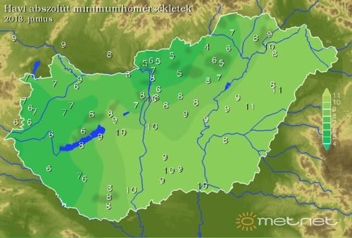 A hónapban mért legalacsonyabb értékek az ilyenkor szokásosnál kissé alacsonyabban alakultak. A hõséget lezáró frontot követõen többször volt derült, szélcsendes éjszakánk, így a Dunántúlon, sok helyen alakult jóval 10 °C alatt a minimum. Északon pedig 5 °C közelébe hûlt a levegõ, de ott még inkább a hó elején mértek egyjegyû értéket.
