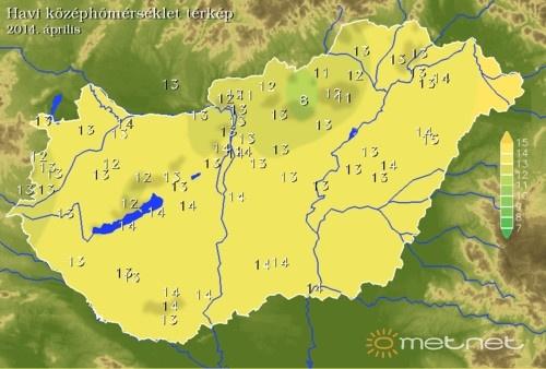 A havi középhõmérséklet a síkvidéki területeken 11 és 14 fok között alakult, mely jellemzõen 2 fokkal haladta meg az ilyenkor szokásosat. A legmelegebbnek az ország déli és keleti része, míg a leghidegebbnek az Északkeleti-középhegység térsége bizonyult. A legalacsonyabb, -3,6 fokos minimumot Romhányban mérték 10-én, míg legmagasabb, 26,6 fokos maximumot Debrecenben 28-án.