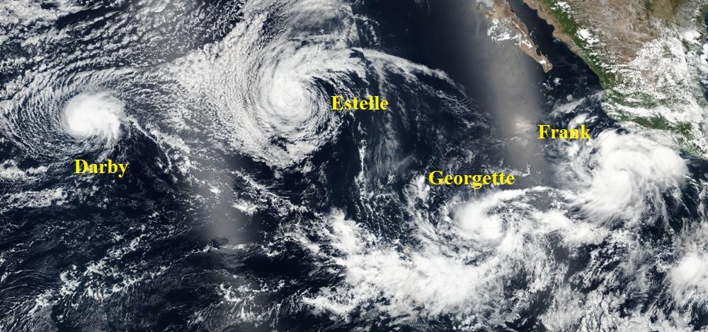Egy idõben jelen lévõ 4 trópusi ciklon az óceánon július 21-én (Georgette ekkor még csak trópusi depresszió volt, így másnap kapott nevet)