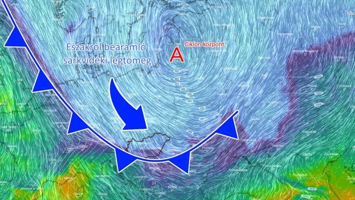 Az Atlanti-óceánon elhelyezkedő igen erős anticiklon meggátolja a nyugat felől érkező enyhe, óceáni eredetű légtömegek beáramlását a kontinens belseje felé, ugyanakkor utat nyit az észak felől lefűződő ciklonoknak, valamint frontjaiknak. Az első ciklon jelen számítások szerint középpontjával Litvánia felett vonul majd el és a hidegfronti szakasza várhatóan kedd késő este éri el hazánkat. Útját viharossá fokozódó északnyugati szél, valamint az ország nagyobbik részén jelentős (5 mm feletti) csapadék kísérheti. A front mögött újabb, több fokkal hűvösebb, immáron sarkvidéki eredetű (-2, -4 fokos) légtömeg érkezik. A legmagasabb hegycsúcsainkon az eső mellett akár az első hópelyhek is megjelenhetnek!
