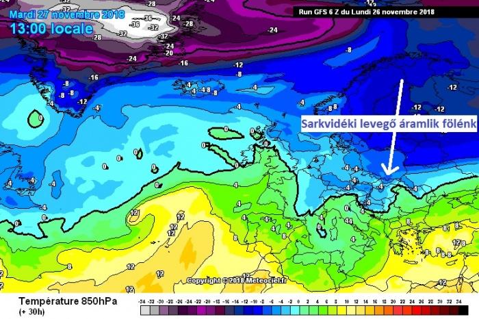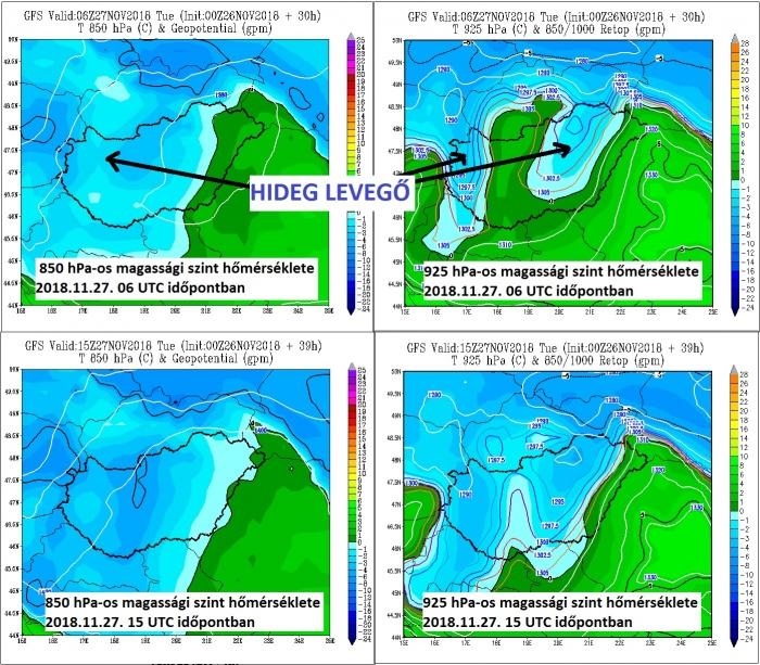 Az alábbi ábrákon látható (850 hPa – kb 1500 méter; 925 hPa – kb 700 méter), hogy hogyan zúdul le a hideg levegő térségünk fölé: