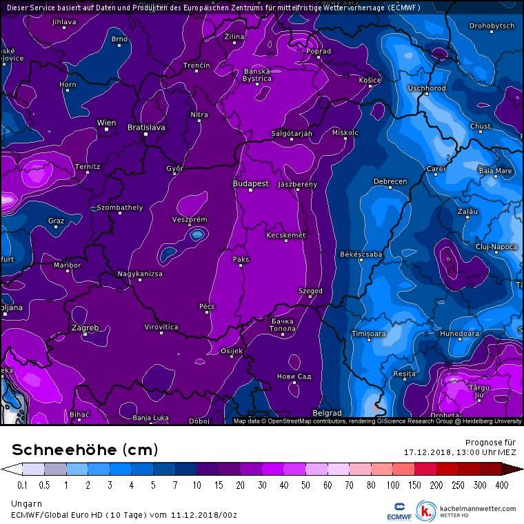 Egy kis összehasonlításként, 12-én az ECMWF éjféli futása még 20-30 cm-es hóréteget vázolt fel hétfő délig: