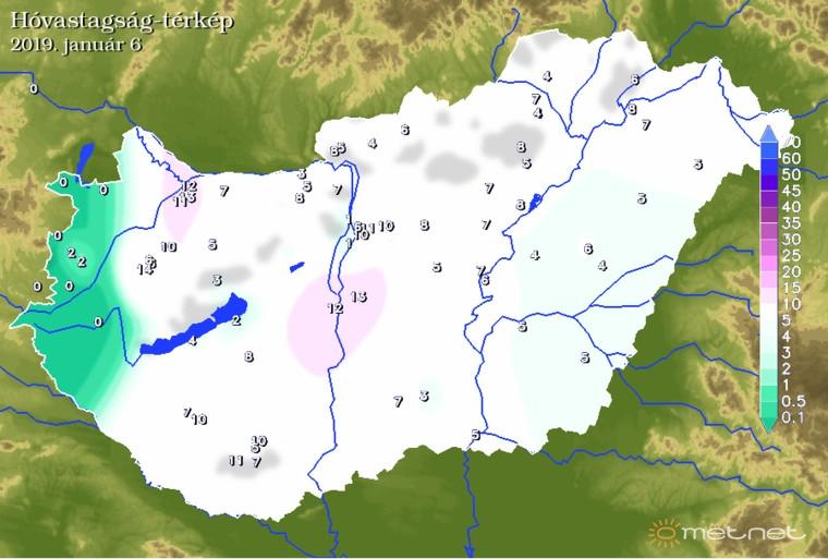 Január 5-én, szombaton egy tőlünk északkeletre elvonuló ciklon melegfrontja érte el hazánkat. Az ilyen ciklonok frontjai általában nem hoznak jelentős csapadékot, de ez a melegfront most kivétel volt. A Nyugat-Dunántúlt leszámítva jelentős mennyiségű csapadék hullott, és hazánk nagy részén kialakult - ha átmenetileg is - 10 centiméter körüli, főként északon, északnyugaton afeletti hótakaró (5. ábra).