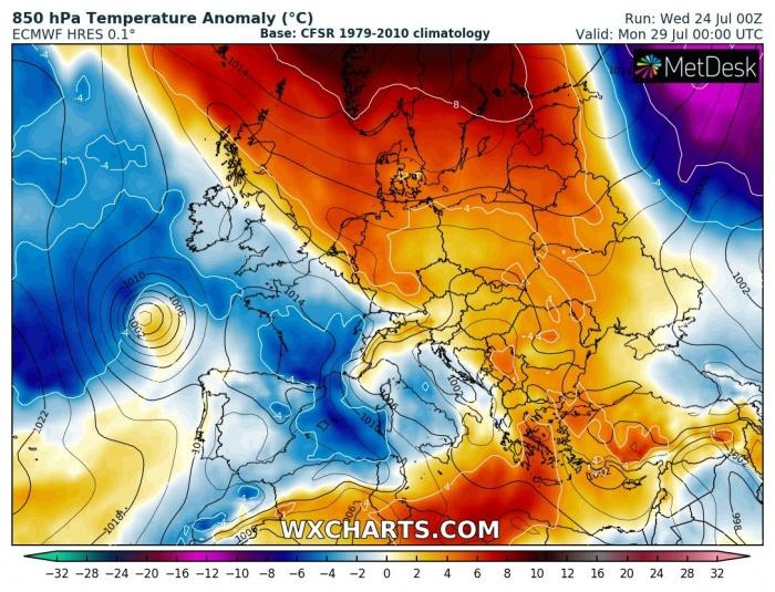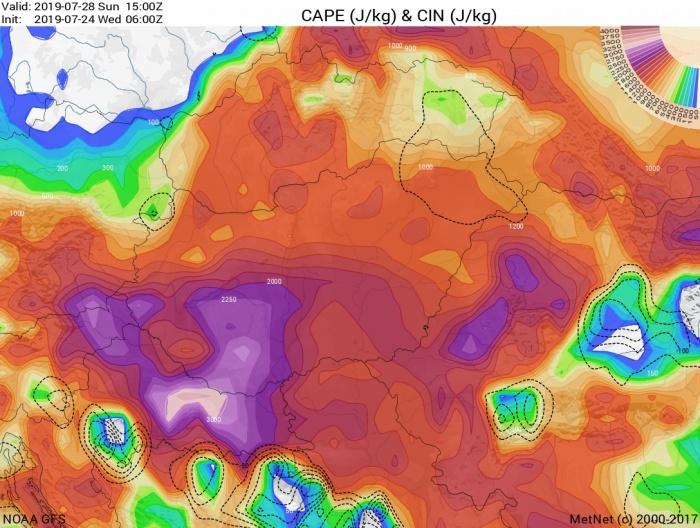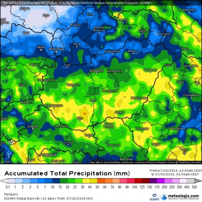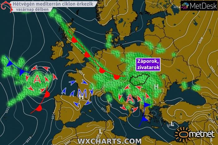 Egy a Skandináv-félsziget felett elhelyezkedő anticiklon hatására a ciklonok és a frontjaik által keltett hullámok délebbre juthatnak a hétvége folyamán, ennek hatására az Alpoktól délre a július második feléhez képest szokatlanul aktív mediterrán ciklon alakulhat ki. Az időjárás-változás első jelei pénteken jelentkezhetnek, mikor is nyugat felől már nedvesebb levegő érkezhet, és főként délnyugaton alakulhatnak ki záporok, zivatarok, helyenként heves zivatarok is lehetnek. Északkeleten is változékony lehet az időjárás, ott egy hidegcsepp okozhat csapadékot. A mediterrán ciklon szombat délutántól fejti ki hatását először, eleinte főként északon és a Dunántúlon, de a délután második felétől másutt is lehetnek záporok, zivatarok. Vasárnap délutántól már országszerte záporos, zivataros időjárás várhat ránk, és ez az idő kitarthat egészen hétfőig. Ami a hőmérsékletet illeti, ugyan visszaeshet pár fokot, de alapvetően marad a nyári idő, ám immáron sokkal inkább trópusi jellegű melegre kell felkészülnünk.
