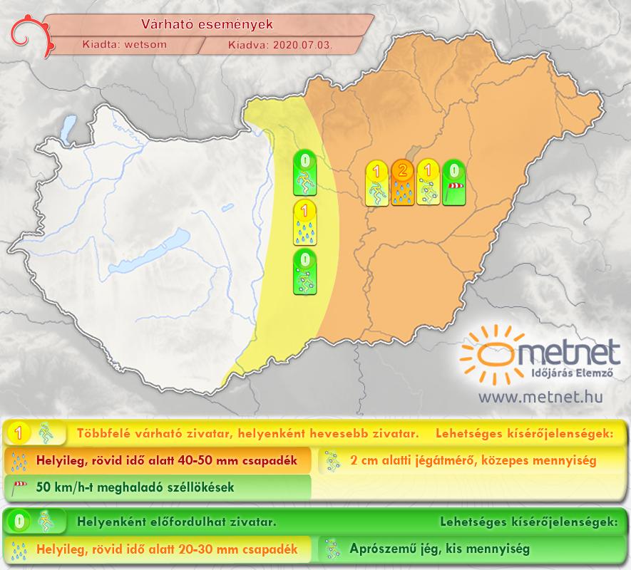 A kora délutáni óráktól kezdve a Dunától keletre alakulhatnak elszórtan zivatarok, majd a késő délutáni óráktól kezdve főként a Tiszántúlon lehetnek többfelé zivatarok. A hevesebb zivatargócokból 40-50 mm-nyi, néhol esetleg 50 mm-nél több csapadék is lehullhat, emellett kis és közepes méretű (1-2 cm átmérő) jég is eshet és erős 55 km/h-t meghaladó, néhol 70 km/h-t is elérő széllökések is előfordulhatnak.