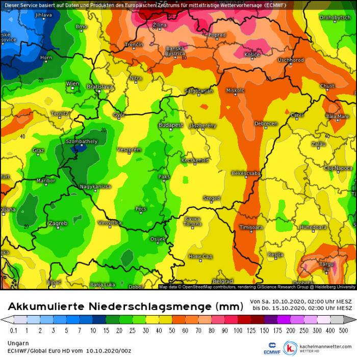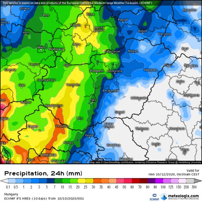 A visszahullámzás és a peremciklon okán, hétfő délutántól meglehetősen nagy az eltérés a modellek között, ami jól mutatja a várható helyzet bizonytalanságát. Az ECMWF modell szerint a front hullámzása megragad a Tiszántúlon és ott várható jelentős mennyiségű csapadék; szerda estig helyenként a 60mm-t is meghaladhatja a lehulló csapadék mennyisége.