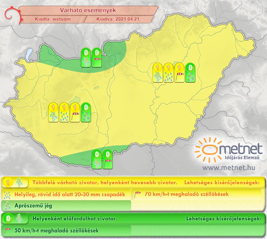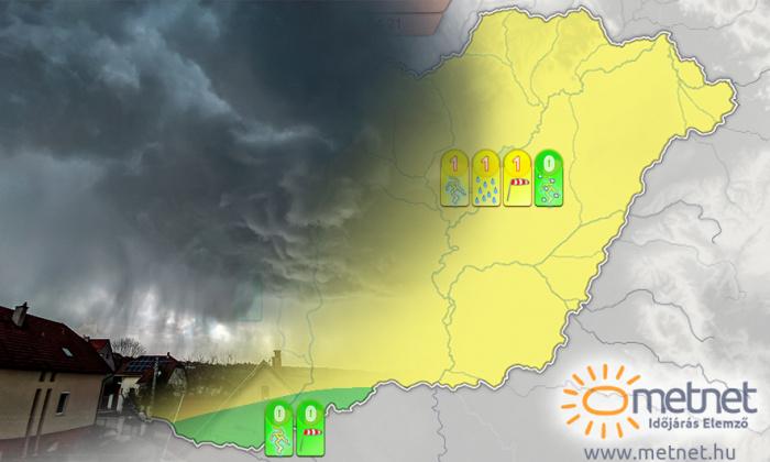Csütörtökön dél körül erős hidegfront éri el hazánk északi, északnyugati részét, záporok, helyenként zivatarok alakulnak ki. Ahogy a front halad az ország belseje felé, egyre nagyobb számba alakulnak ki zivatarok, helyenként intenzív zivatarok. A front a kora esti órákra éri el a déli határvidéket, ekkor már kevesebb helyen dördül meg az ég. Az intenzív zivatargócokból 20-30 mm-nyi csapadék is lehullhat, emellett aprószemű (0,5-1,5 cm) jég is eshet és viharos 70 km/h-t meghaladó széllökések is előfordulhatnak, sőt északkeleten néhol a 90 km/h-t meghaladhatja egy-egy lökés.
