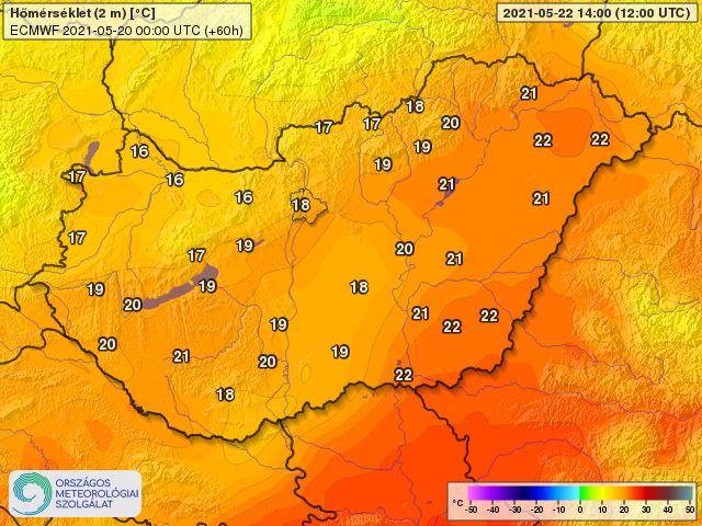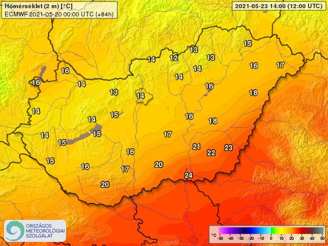 Becsült hőmérsékleti értékek szombat délutánra (ECMWF/OMSZ)