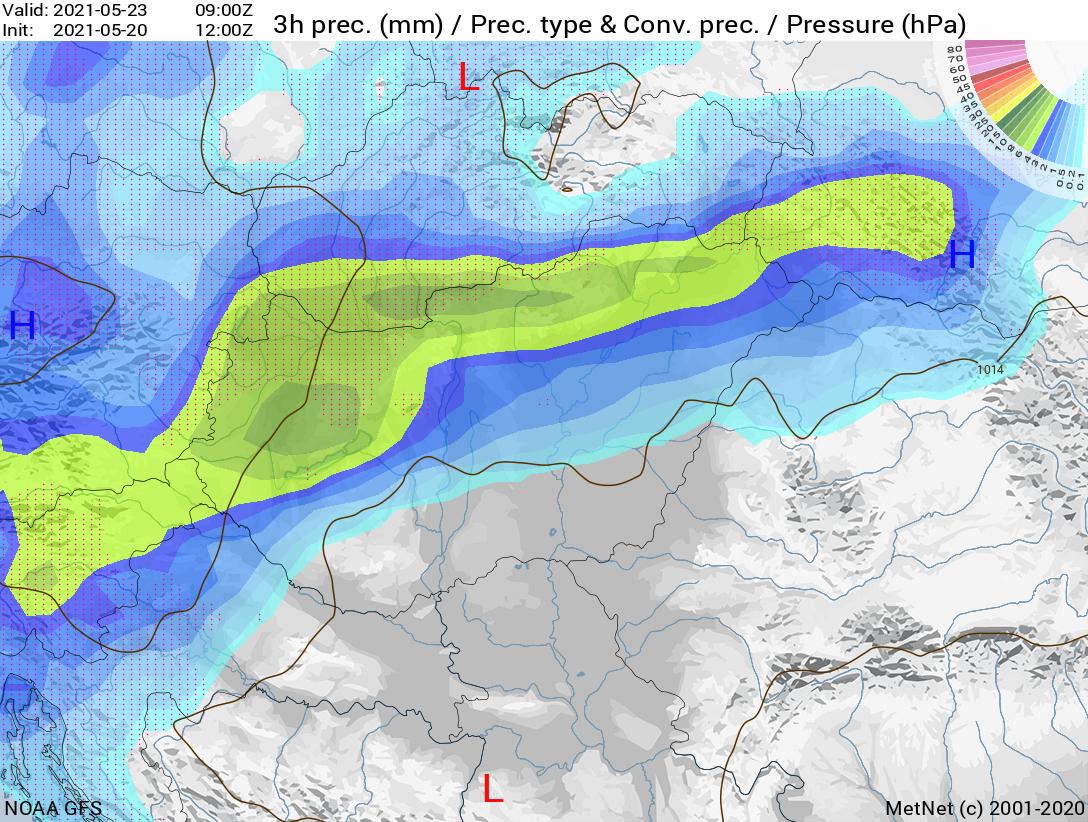 Pünkösdhétfőn a mostani számítások szerint délnyugatira fordul az áramlás, ezzel több fokkal melegebb, de továbbra is nedves levegő áramlik fölénk, ezért ismétlődő záporokra, zivatarokra is fel kell készülnünk. A melegedés következtében ismét 20 fok köré melegszik a levegő az ország nagyobbik felén, sőt délkeleten a 25 fokot is megközelítheti a hőmérő higanyszála.