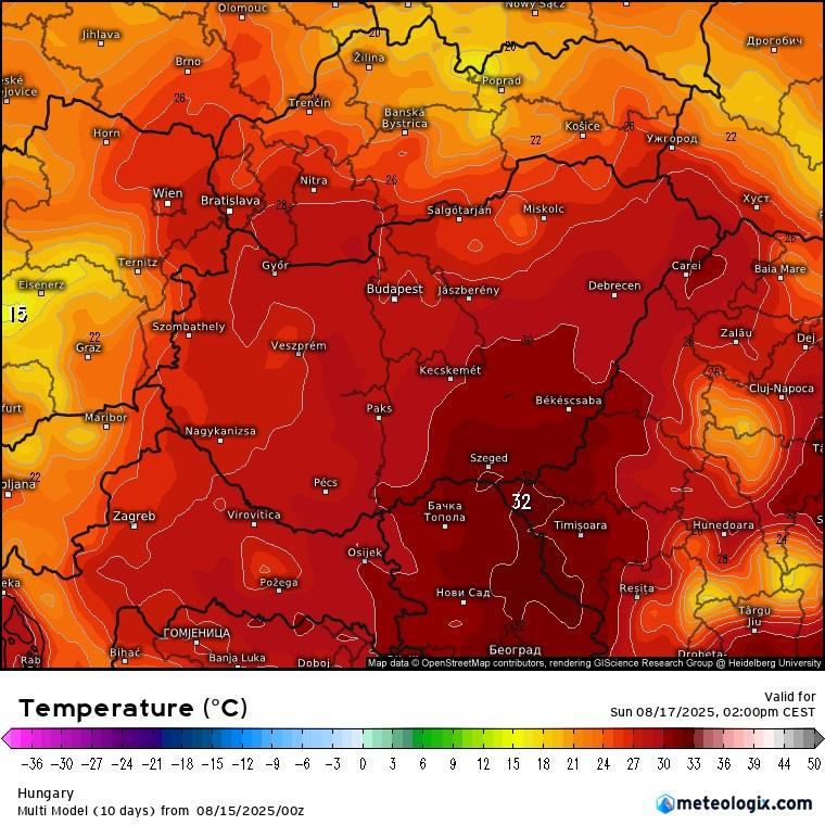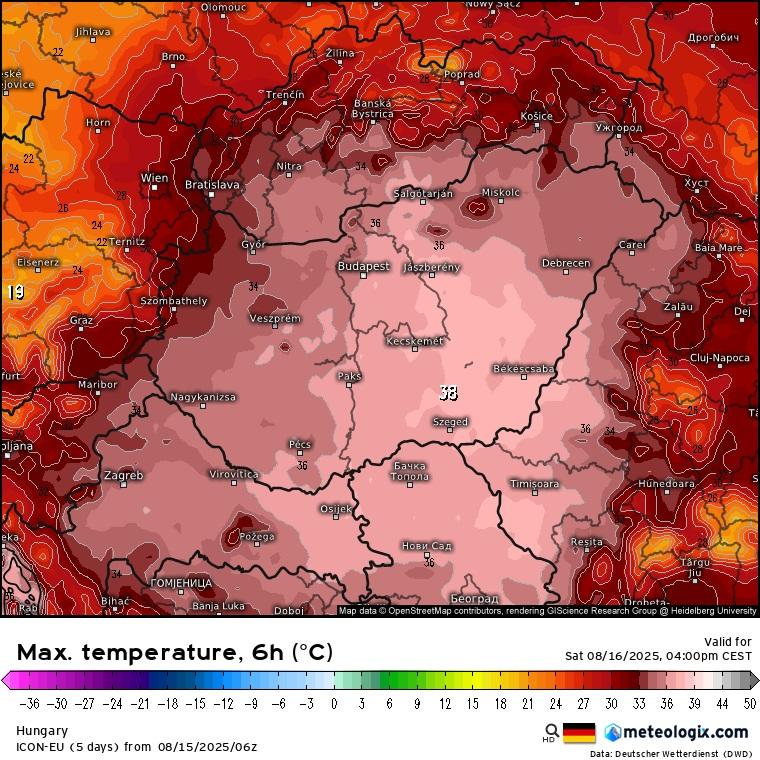 Szombaton a front előterében igen magasra emelkedik a hőmérséklet, többfelé mérhetünk majd 35 fok feletti értékeket, az Alföldön helyenként a 40 fokot is megközelítheti majd a hőmérő higanyszála. Az északnyugati csücsökbe viszont már beszivárog némi hideg levegő, aminek hatására ott már "csak" 30 és 35 fok közötti maximumok várhatóak.
