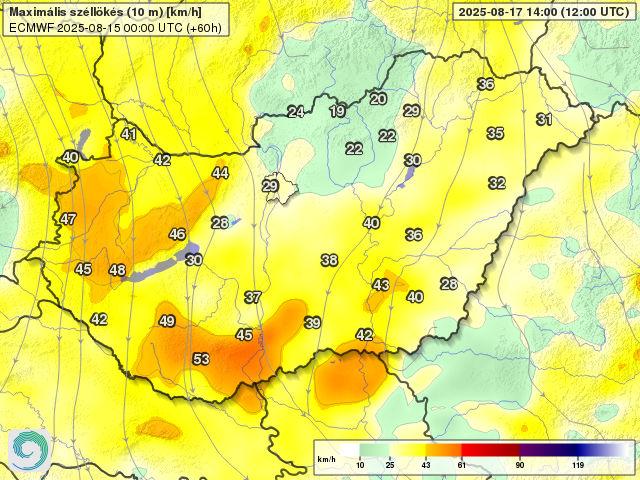 Becsült maximális széllökések vasárnap délután. (Modell: ECMWF)