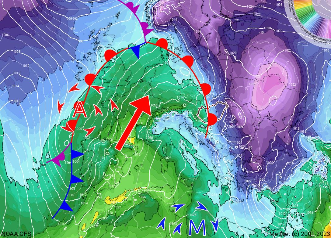 Európa időjárásában jelentős változás kezdődik, hiszen az utóbbi hetekben jellemző északias irányítást déli, délnyugati áramlás váltja fel. Ennek oka az, hogy az eddig a Skandinávia, illetve a kontinens délnyugati része felett elhelyezkedő anticiklon keletre helyeződik át és ezzel párhuzamosan az Atlanti-óceán fölött ciklonok alakulnak. A két képződmény közös áramlási rendszerében pedig délnyugat felől érkezik az enyhe, változó nedvességtartalmú levegő.
