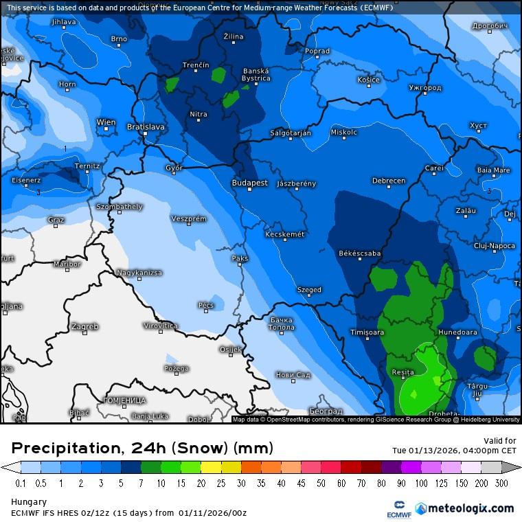 És, hogy mennyi hó várható? A mostani számítások szerint nagyjából a Budapest-Békéscsaba tengelyen 5-10 mm-nyi havas csapadék várható, ami azt jelenti, hogy ezen a sávon 5-10 centiméternyi hó is leeshet, de a keleti határszélen 10 cm-t meghaladó hó is lehullhat, míg északkeleten jellemzően 3-6 centiméternyi hó várható.