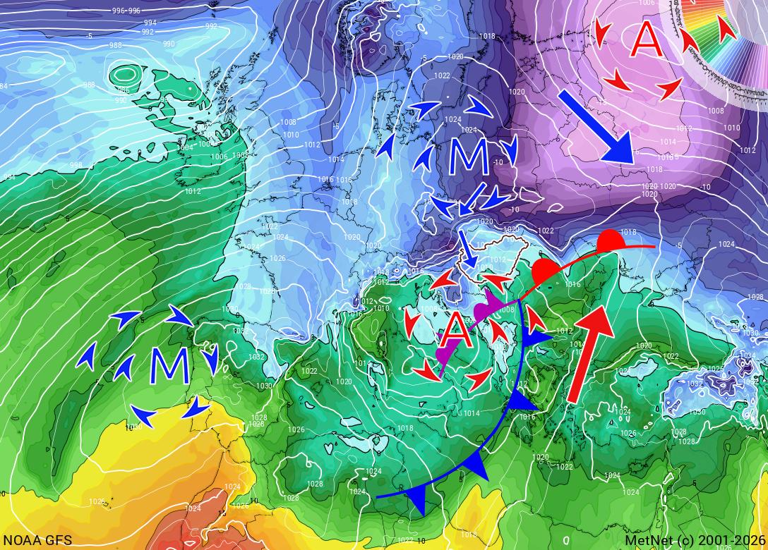 A kontinens időjárását a Kelet-Európa felett elhelyezkedő anticiklon és annak a délnyugati peremén örvénylő ciklon, illetve a Brit-szigetek felett örvénylő ciklon határozzák meg. A Brit-szigetek felett örvénylő ciklonból válik ki egy hullám, ami felelős lesz a mediterrán ciklon kialakulásáért. A kialakuló mediterrán ciklon előterében igen meleg levegő áramlik fölénk, miközben az anticiklon peremén elhelyezkedő ciklon hátoldalán hideg levegő indul el hazánk felé, és ez a két légtömeg fog a Kárpát-medence felett keveredni csütörtökön és pénteken.
