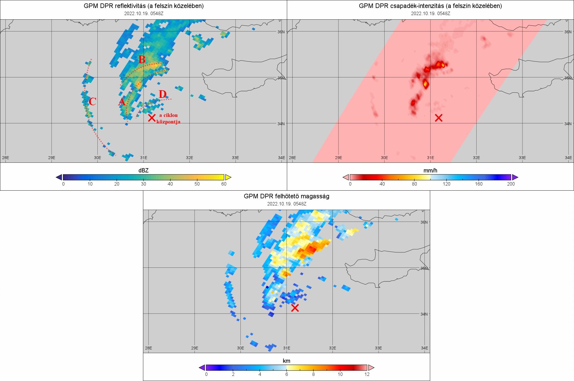 A DPR szenzor által mért refelktivitás, csapadék-intenzitás és felhőtető magasság október 19-én 05:48 UTC-kor