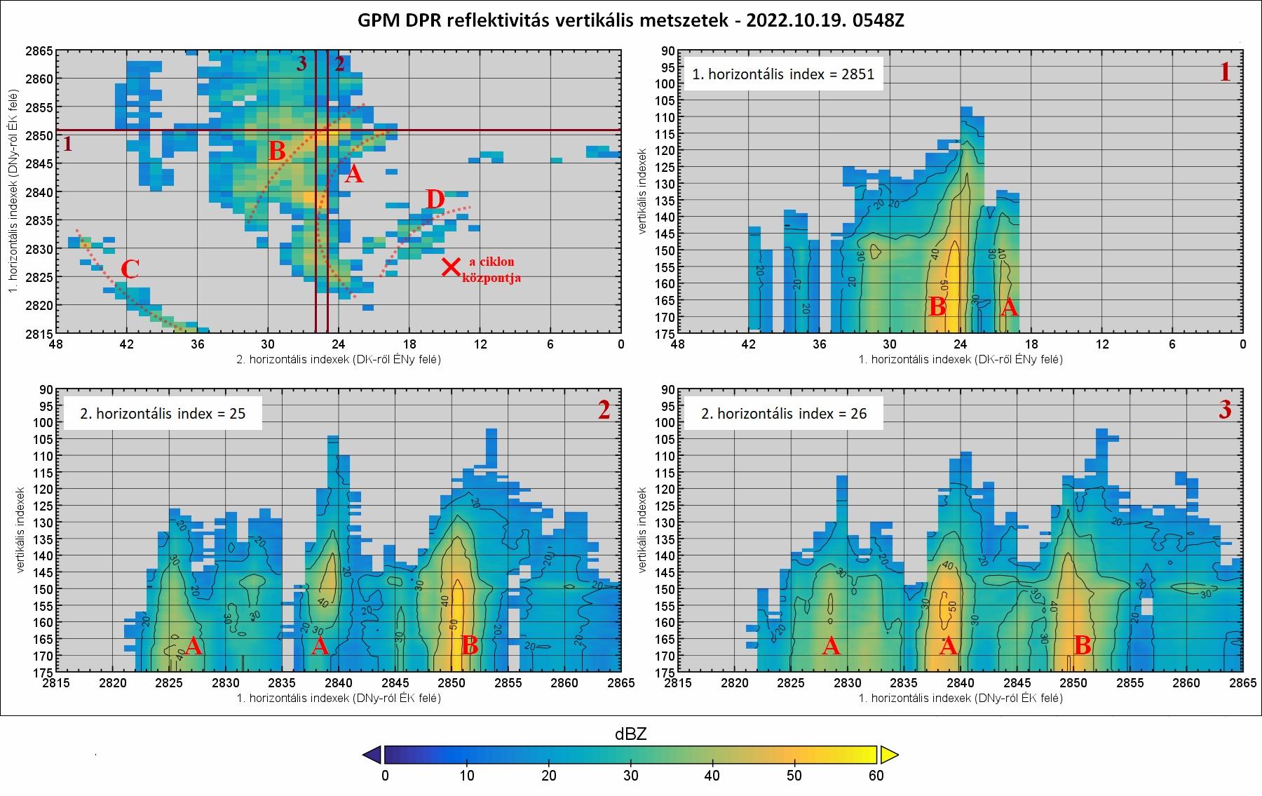 A DPR szenzor által mért refelktivitás vertikális metszetei az erősebb csapadékkarokon keresztül október 19-én 05:48 UTC-kor