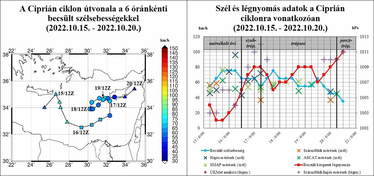A Ciprián ciklon 6 óránkénti útvonalának és intenzitásának (szélerősség, központi légnyomás) elsődleges becslése