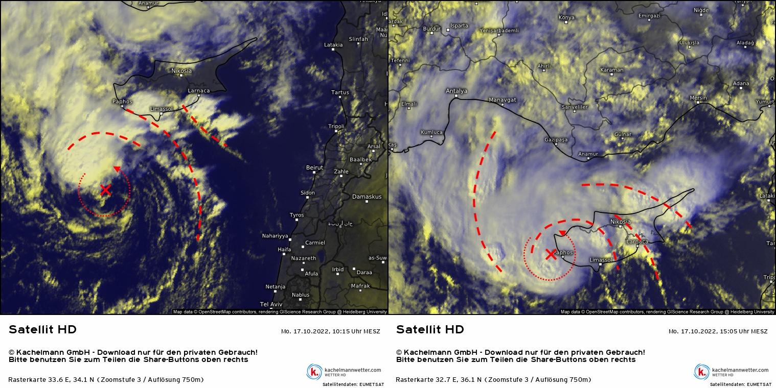 A Ciprián ciklon még mérsékelt övi jelleget mutatva, kiterjedt zivatarrendszerekkel az északkeleti, keleti oldalán október 15-én 13:15 UTC-kor és október 16-án 06:15 UTC-kor