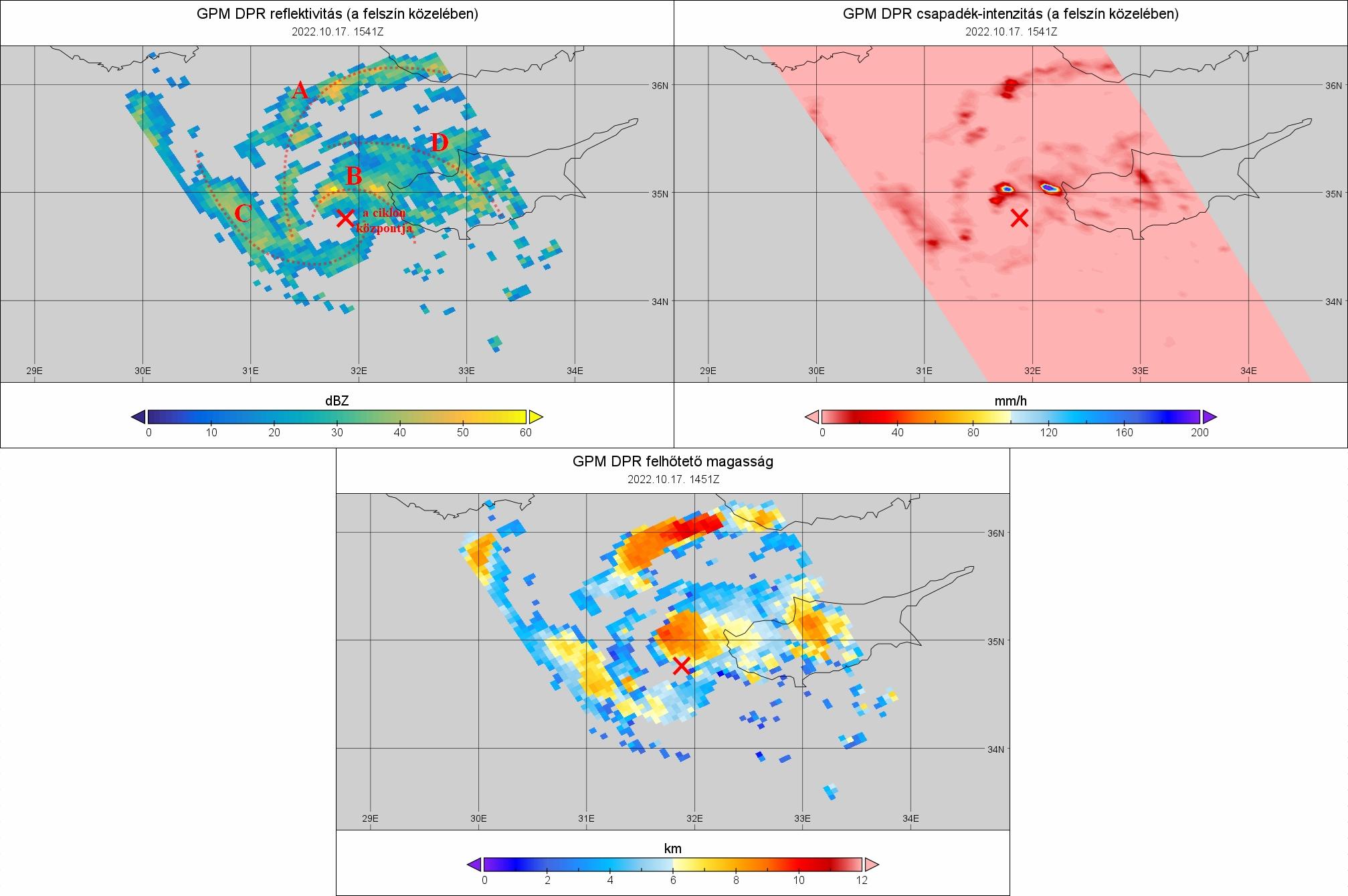 A DPR szenzor által mért refelktivitás, csapadék-intenzitás és felhőtető magasság október 17-én 15:41 UTC-kor