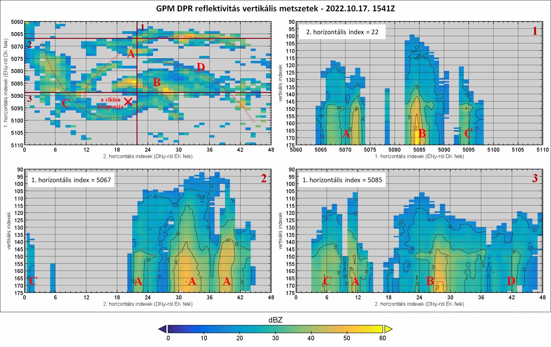 A DPR szenzor által mért refelktivitás vertikális metszetei az erősebb csapadékkarokon keresztül október 17-én 15:41 UTC-kor