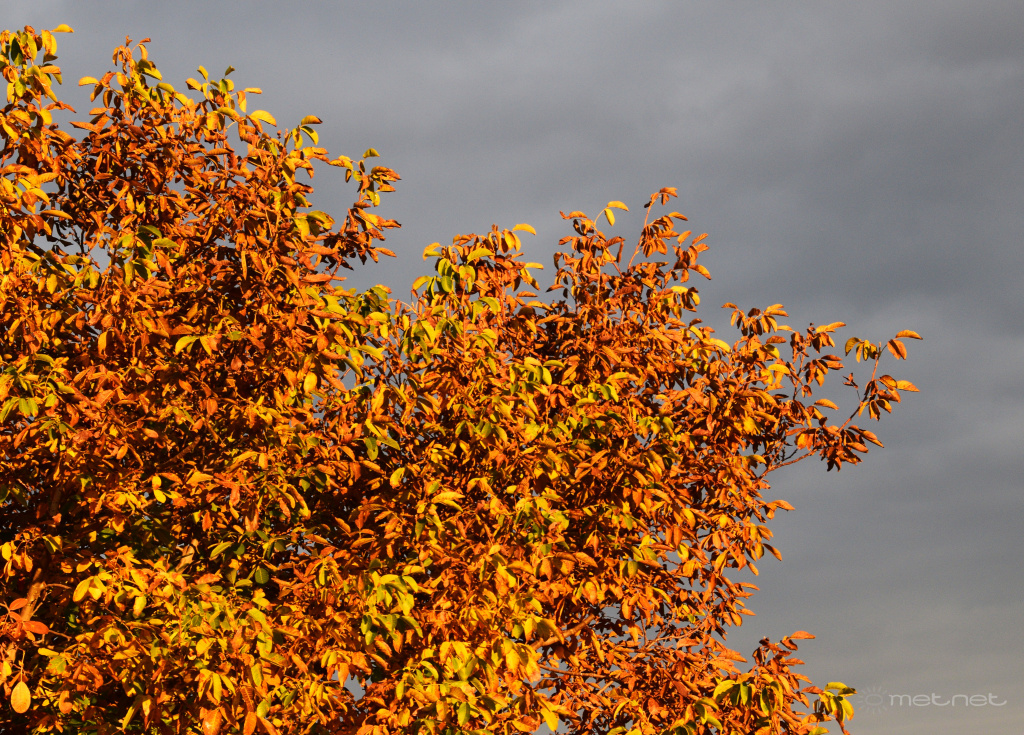 | Leírás: Lemenni készülő Nap által megvilágított őszi fa, felhős, szürke időben | |