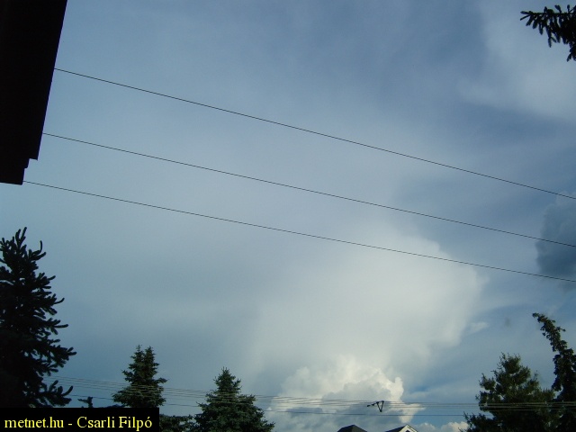 2010-06-13 20:02:34 - Kosakiss Nagyon érdekes kép: látni, amint a legfrissebben keletkezett zivatarfelhõ eléri egy korábbi, elhalt zivatarfelhõ fátyolfelhõvé alakult tetejét - sõt, lehet, hogy át is tör azon, csak a földfelszinrõl ezt nem lehet megállapitani. Nagy melegben az úgynevezett hõzivataroknak ez a szokásuk.