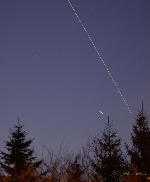 | Leírás: A Nemzetközi Ûrállomás, a rásütõ távoli napfény miatt piros (a Nap 10 fokkal volt a láthatár alatt) | |