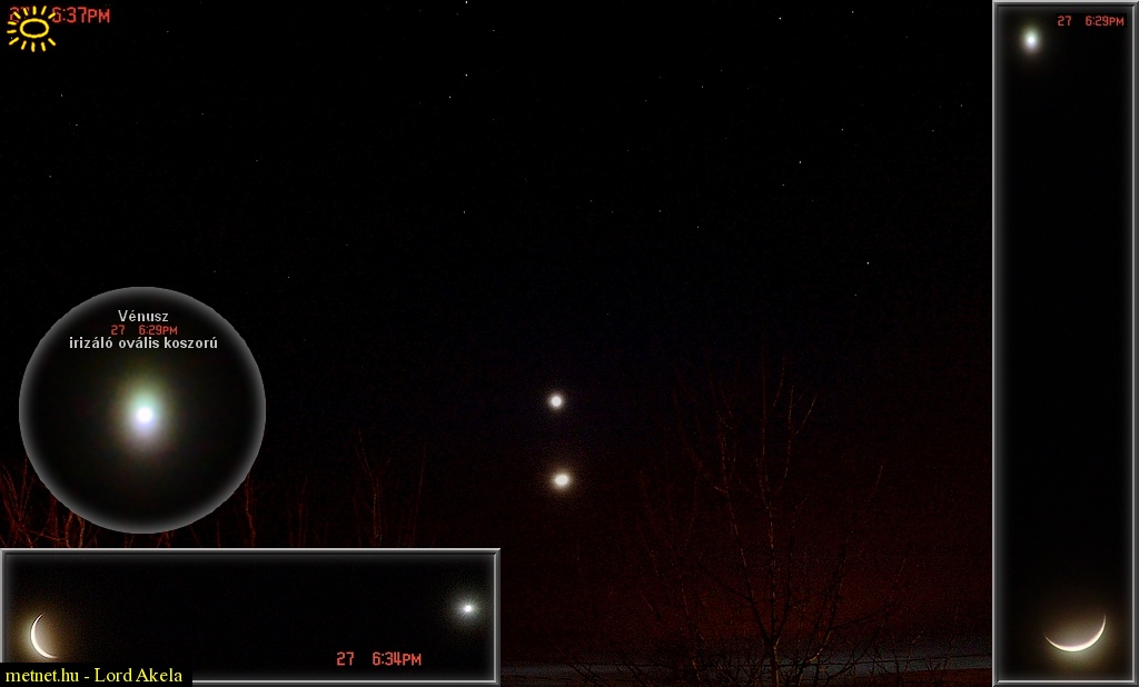 Leírás: LHT 17:33 még reménytelen ég volt. Késõbb kezdtek eloszlani a felhõk 18:29 a Vénuszt ovális, irizáló koszorú övezte; 18:33 a Vénusz "csillagsugarasra" tisztult (az optika generálja) A jobboldali csík mutatja a valós (telézett) állásszöget. A kerti világítás miatt a közeli fák vörösesre szinezõdtek. Az alapkép közepe táján a túlparti városrész visszfénye vet vörös foltot a felhõzetre (a fa mögött). EXIF F2,0 ISO200 10sec (Sony F828)