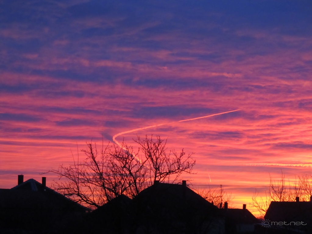 | Leírás: Kondenzcsíkkanyar és árnyéka a naplementében. | |