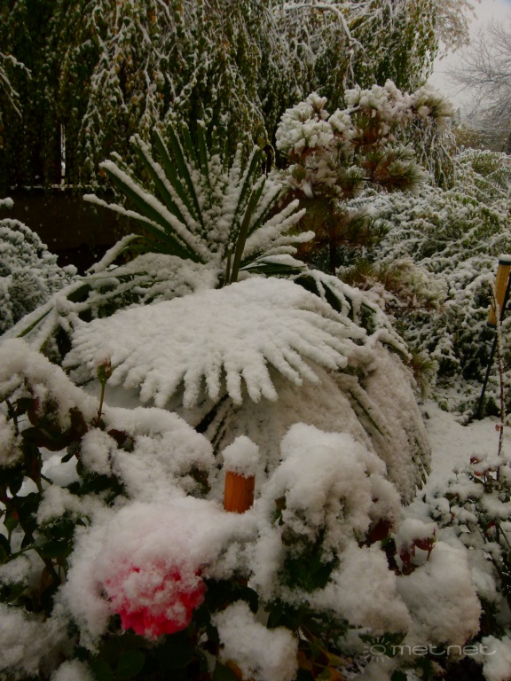 | Leírás: Ez a kép 2012. október 29-én reggel készült a budapesti kertemben. A reggeli, nem várt havazásból 2-3 cm hó hullott, mely délutánra sajnos elolvadt. A képen a behavazódott virágoskert látszik egy kínai kenderpálmával. | |
