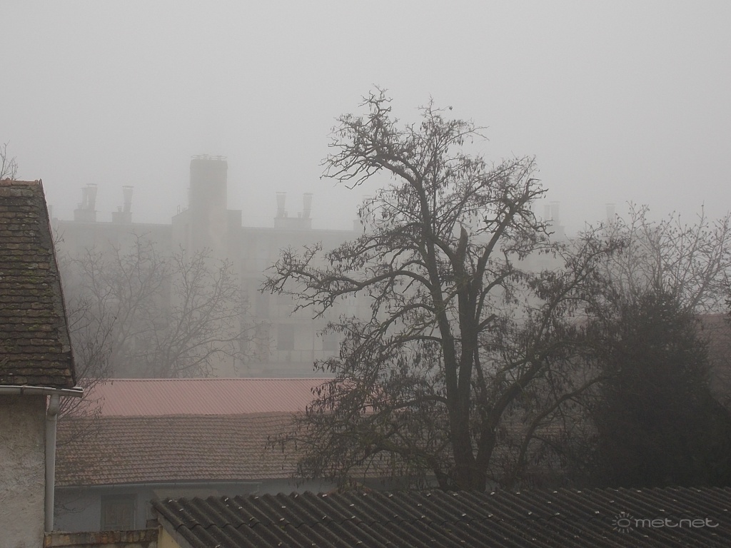 | Leírás: Köd; 50 m= akácfa 100m= garázsok 150m= társasház kéményei, cca.280m= templomtorony, nem látszik. | |
