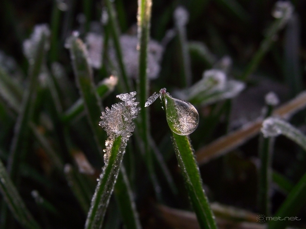 | Leírás: Részben megfagyott harmatcsepp és dér. | |